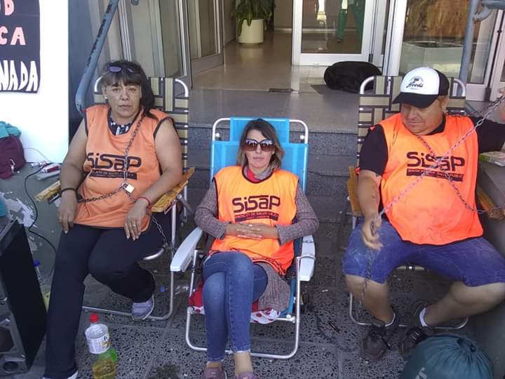 En Chubut continuará el encadenamiento de los dirigentes de SISAP-Fesprosa en el Ministerio de Salud. Comenzó un nuevo paro de 48 horas exigiendo el pago de los salarios adeudados al gobierno de Arcioni. Analizan también el comienzo de una huelga de hambre.